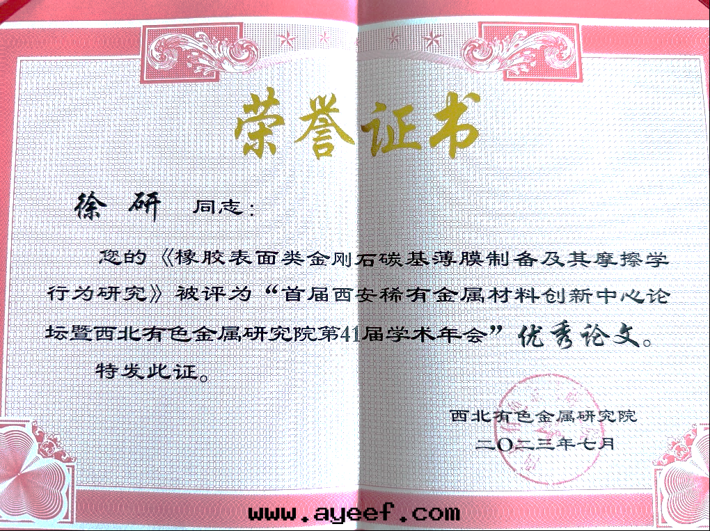 7月(yuè)20日(rì)-22日(rì),西(xī)北(běi)有(yǒu)色(sè)金(jīn)屬研究院(yuàn)在(zài)西(xī)安(ān)召開(kāi)“首屆西(xī)安(ān)稀有(yǒu)金(jīn)屬材料創新(xīn)中(zhōng)心(xīn)論壇暨西(xī)北(běi)有(yǒu)色(sè)金(jīn)屬研究院(yuàn)第(dì)41屆學(xué)術(shù)年(nián)会(huì)”。此(cǐ)次(cì)論壇展(zhǎn)現(xiàn)了(le)材料領域新(xīn)态势、新(xīn)進(jìn)展(zhǎn)和(hé)新(xīn)成(chéng)果(guǒ),大(dà)会(huì)最(zuì)終(zhōng)評選出(chū)優秀論文(wén)12篇(piān)。我(wǒ)公(gōng)司徐研撰写(xiě)的(de)《橡胶表(biǎo)面(miàn)類(lèi)金(jīn)剛石(dàn)碳基薄膜制备及(jí)其(qí)摩擦學(xué)行为(wèi)研究》從300多(duō)篇(piān)學(xué)術(shù)報告中(zhōng)脫穎而(ér)出(chū),入(rù)選第(dì)41屆學(xué)術(shù)年(nián)会(huì)優秀論文(wén)。